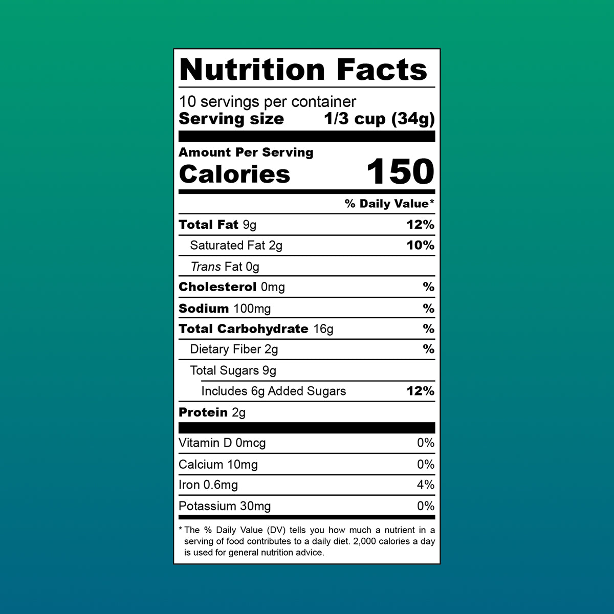 Water, Certified Gluten-Free Organic Oats, Dried Cranberries (Cranberries, Sugar, Sunflower Oil), Pecans, Coconut, Pure Organic Maple Syrup, Walnuts, Organic Extra Virgin Olive Oil, Pumpkin Seeds, Sunflower Seeds, Organic Brown Sugar, Flaxseed, Kosher Salt, Vanilla Extract (Water, Alcohol (35%), Sugar, Vanilla Bean Extractives), Cinnamon, Nutmeg